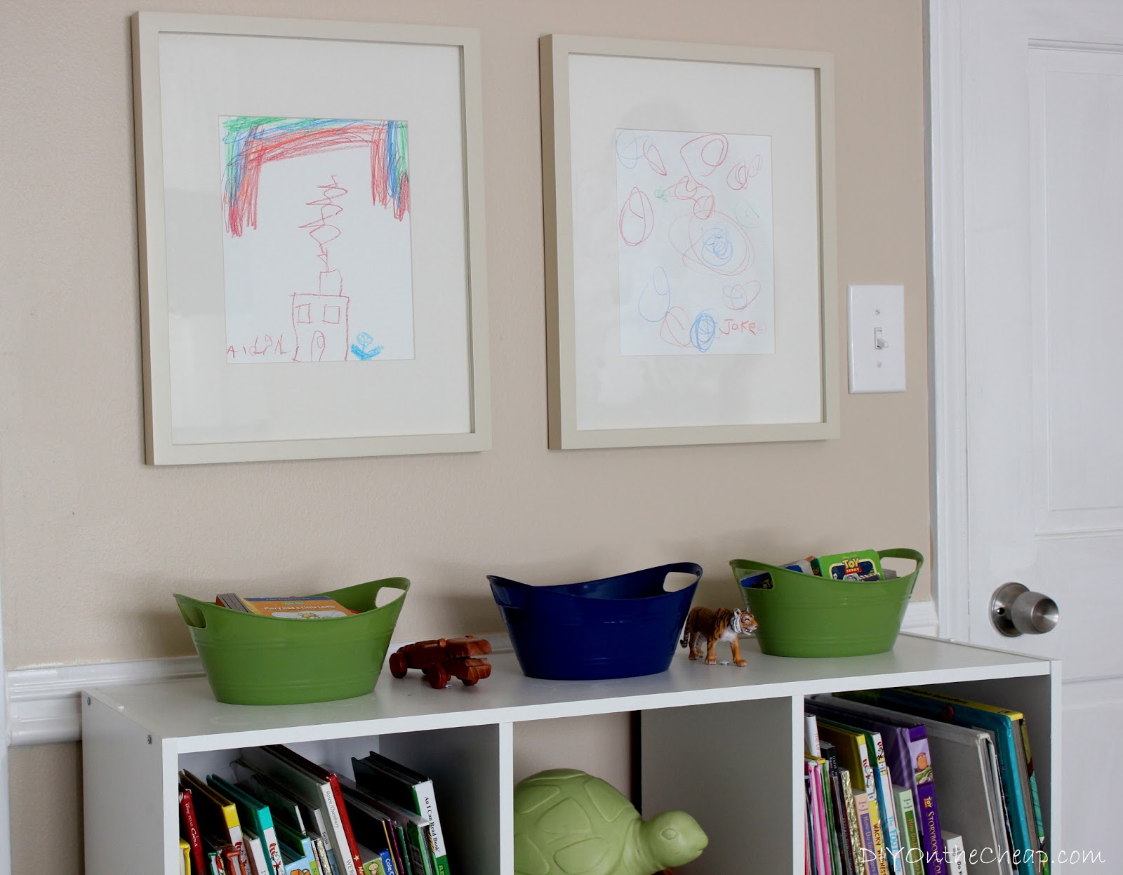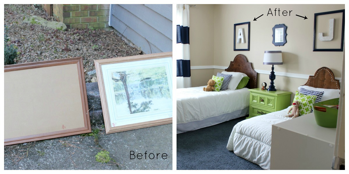 These frames were found by my friend Erica for just a couple bucks each at a thrift store. I removed the artwork and backing, spray painted them navy blue and mounted them on the wall with each boy’s initial inside.