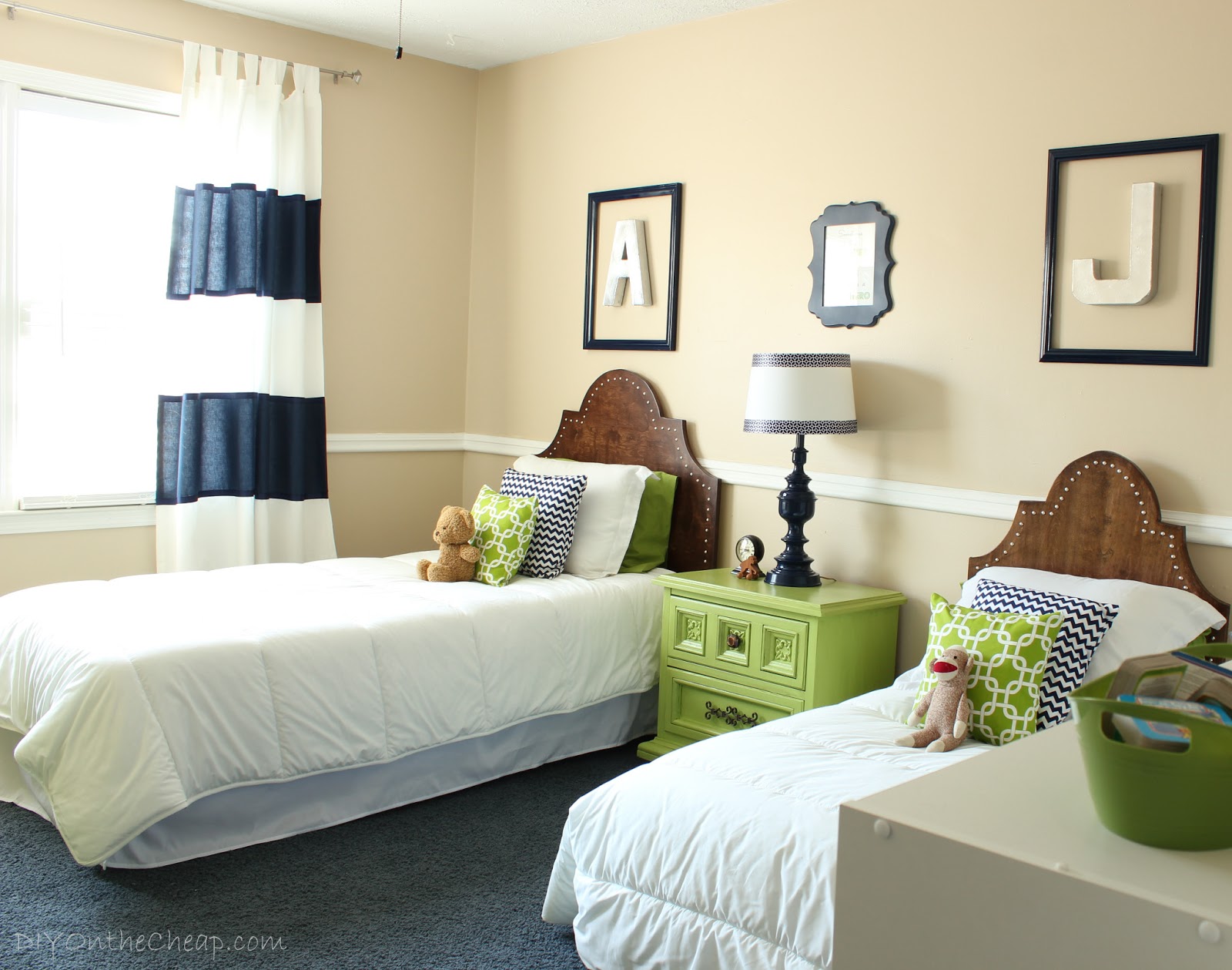 I thought it would be fun to take a quick look at some “Before & After” shots of some of the individual pieces in the boys’ room, as well as give a little source list of where things came from. If you’re just stopping by for the first time – here’s a quick rundown of what has gone on around here. I made over our sons’ shared bedroom in 2 weeks while being filmed for a series of super short segments for HLN. It’s finally done! We’re all breathing a sigh of relief and I’m propping my feet up for a while.