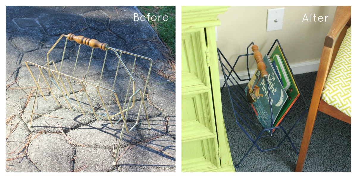 This magazine holder was found for a couple bucks at a thrift store, and it had a shiny brass finish. I spray painted it the same navy color as the frames and lamps, and now it sits next to their chair and holds a few of the boys’ favorite books.